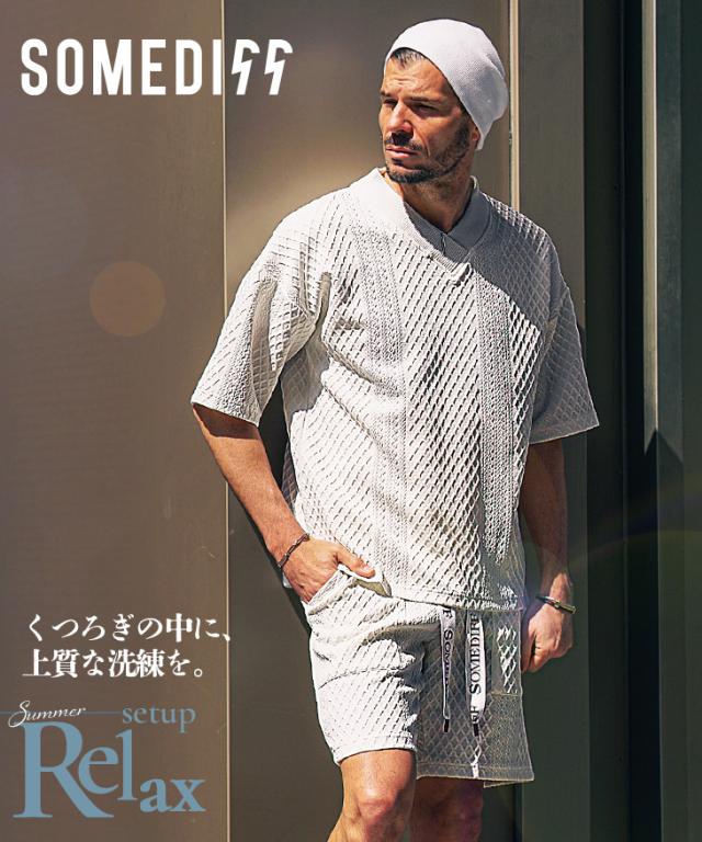 SOMEDIFF (サムディフ) 『リラックスVネックセットアップ』【リラックスセットアップ】■Design/デザインストレスフリーな着こなしを楽しめるイージーなセットアップ。オトナのリラックスをイメージして出来上がったセットアップなので、夏でも着やすくオトナの余裕を感じさせる。異なる凹凸のパターンを生地の切り替えとして挟むことでシンプルながら目を惹くデザインに。軽量でありながらもストレッチ性に優れ、洒脱な着こなしに仕上げてくれる。夏の装いが楽しくなるセットアップで季節を魅了する。