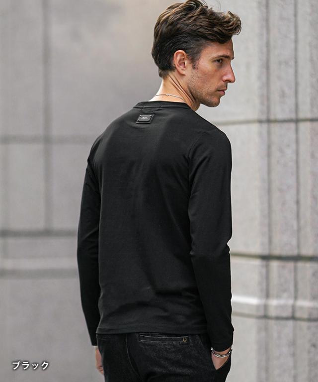 Black by VANQUISH 『発砲プリント長袖Tシャツ』【発砲プリント長袖Tシャツ】■Design/デザイン全体をシンプルにまとめながらも発砲プリントのロゴを入れることで違いを魅せつける。フロントの中央部分に2色でデザインした発砲プリントのロゴは、立体的で印象に残るデザインに。また、うなじ部分にはメタルのロゴプレートを配置することで男らしさを際立たせる。生地は伸縮性をもたせているので、着用した際はストレスなく快適な着心地を提供します。確かな存在感と汎用性で、活躍間違いなしの一枚。
