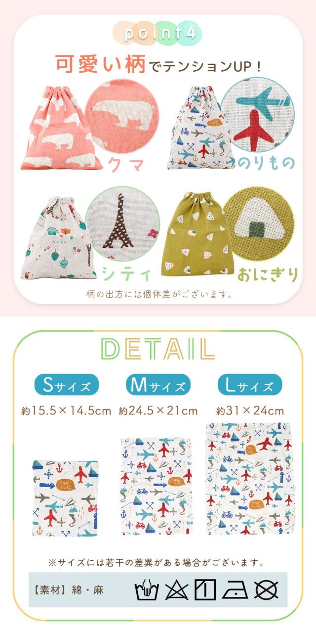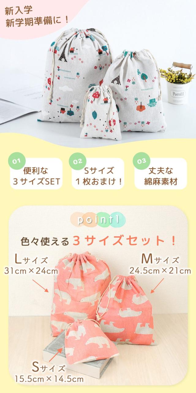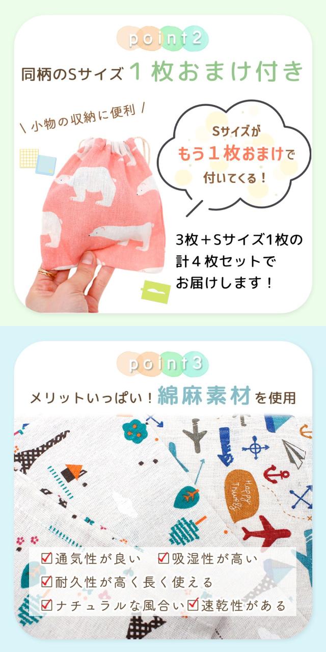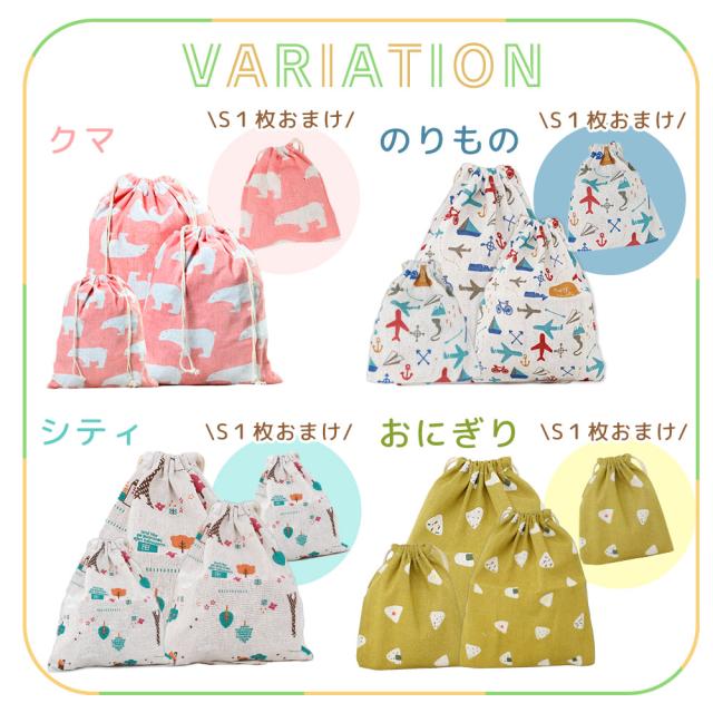 ・通園通学にちょうどいい 巾着ポーチ3サイズセット S/M/L