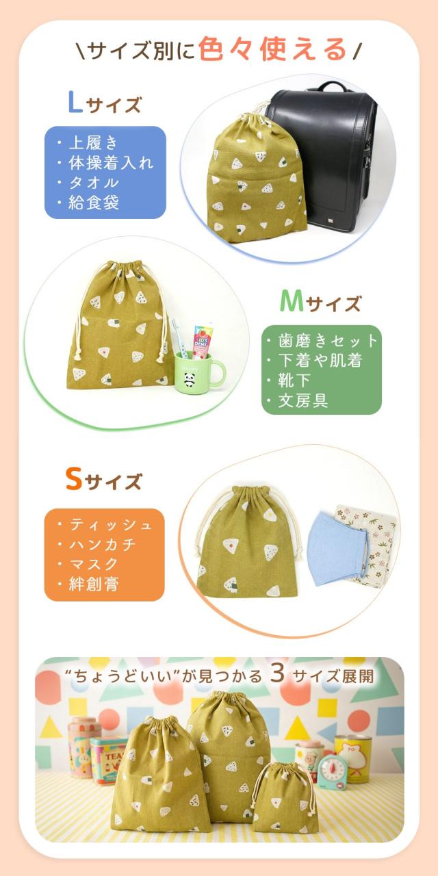 毎日の通園・通学で増えがちな小物をまとめやすい、巾着/ポーチの3サイズセットです。給食/給食袋/給食着/エプロン入れ/着替え袋/着替え入れとして使いやすく、幼稚園/保育園/小学校まで幅広く対応。コップ/歯磨きセット/カトラリーなどのお道具入れにも便利で、用途に合わせてS/M/Lを使い分けできます。マスク入れとしても使えるので、清潔に持ち歩きたい時にもおすすめです。