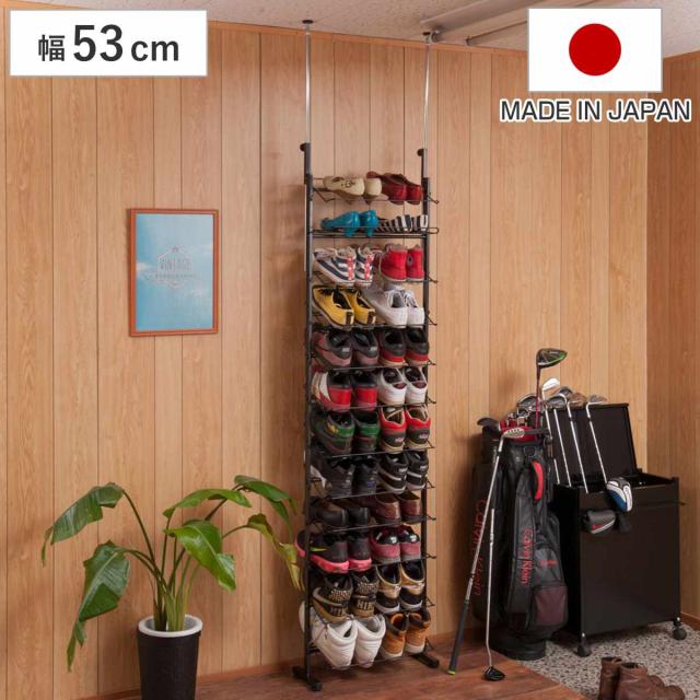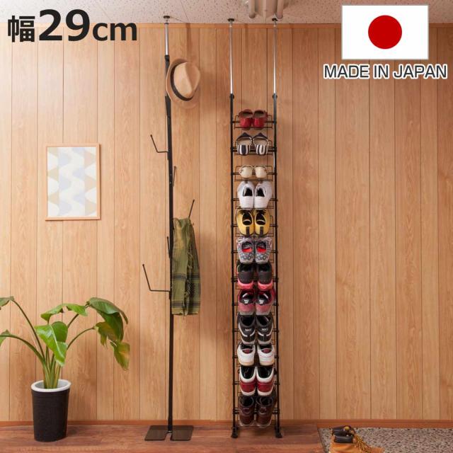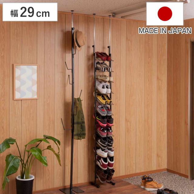 突っ張り シューズラック 幅29cm 薄型 ブラック 日本製 見せる収納 ( 壁面収納 つっぱり スリム 省スペース 靴収納 最大12足 つっぱり式 天井突っ張り式 靴 スニーカー ブーツ ヒール 収納 ラック シューズボックス 靴箱 下駄箱 )