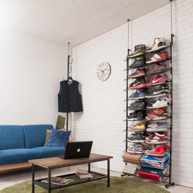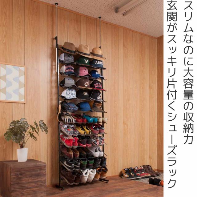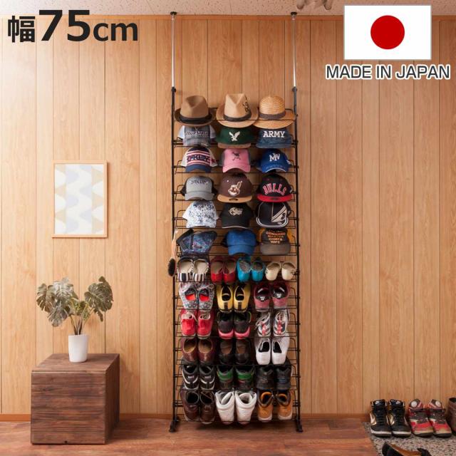 突っ張り シューズラック 幅75cm 薄型 ブラック 日本製 見せる収納 ( 壁面収納 つっぱり スリム 省スペース 靴収納 最大36足 つっぱり式 天井突っ張り式 靴 スニーカー ブーツ ヒール 収納 ラック シューズボックス 靴箱 下駄箱 )