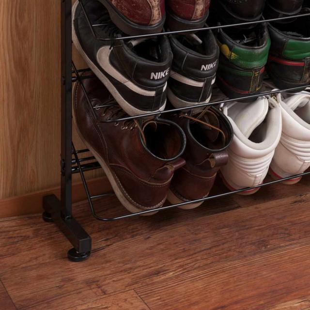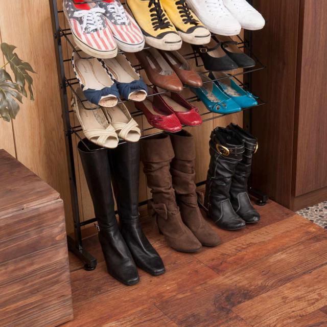 ぺったんこのシューズはもちろん、ワイヤー部分にヒール部分が引っかかるのでハイヒールでも収納できます。棚板を外せば背の高いブーツや長靴も収納可能です。