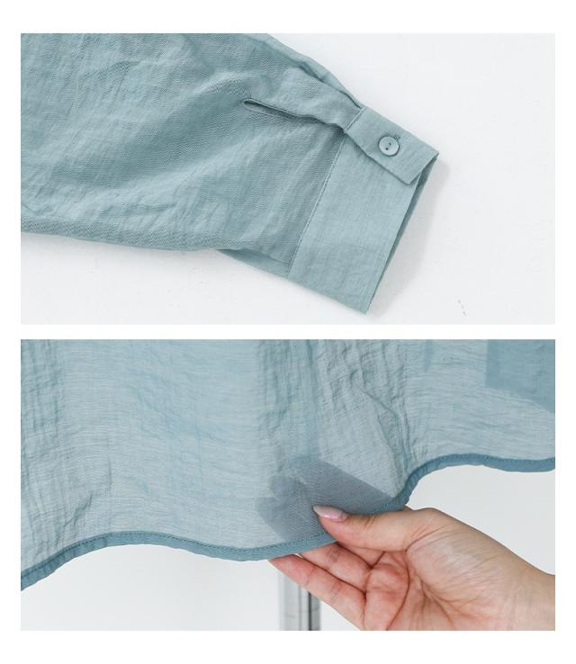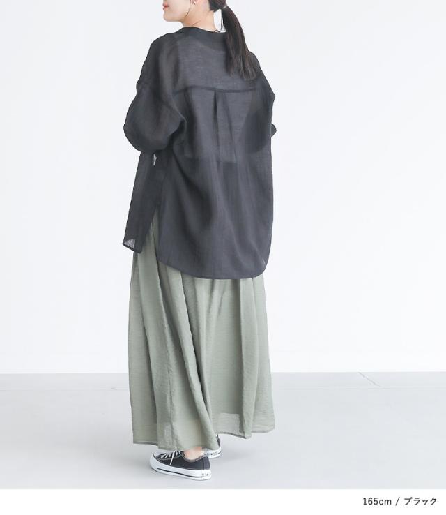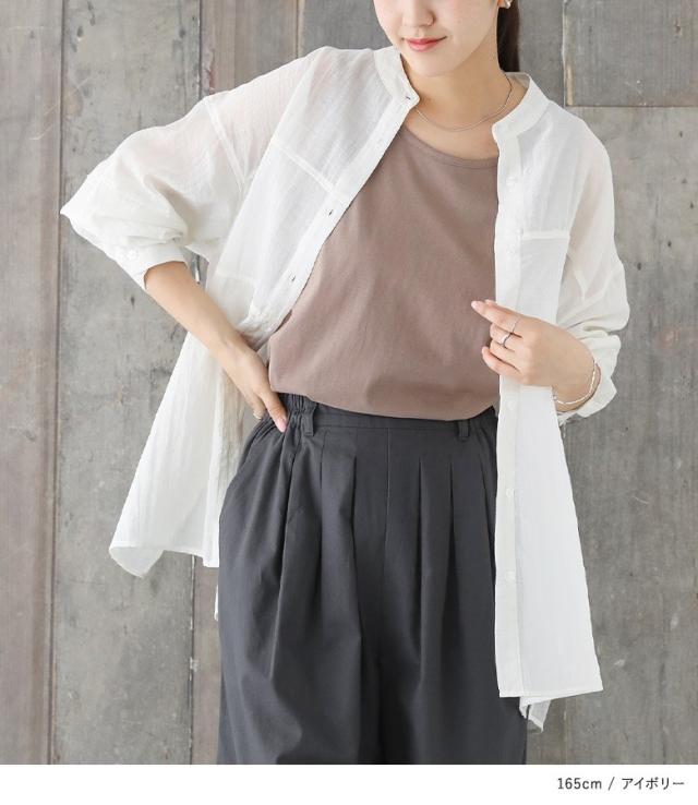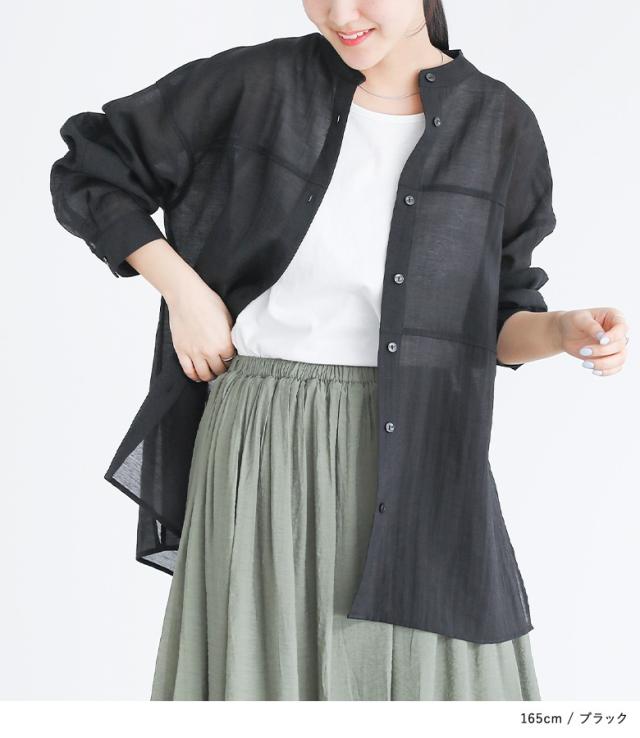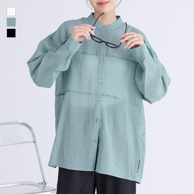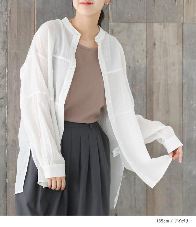 『胸切り替えバンドカラーシャツ』【メール便不可】【20】[トップス レディース 長袖 シャツ バンドカラー 切り替え シアー 透け感 春 夏 秋 オシャレウォーカー]