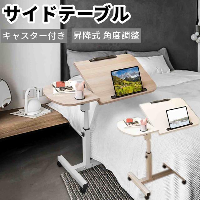 サイドテーブル キャスター付き 90°折り畳み可能 昇降式 パソコンデスク 高さ調整 角度調整 無段階高さ調節 PCテーブル 凹溝付き カップホルダー付き オフィスデスク 移動式テーブル 省スペース 勉強机 仕事デスク ベッドテーブル おしゃれ 介護用テーブル