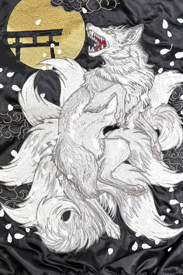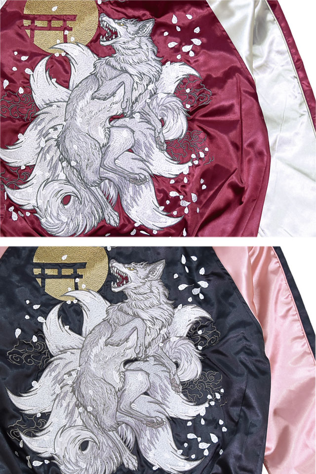 九尾サテンスカジャン 朧 9051811 和柄 和風 刺繍 狐 きつね キツネ 妖怪 スーベニアジャケット おぼろ
