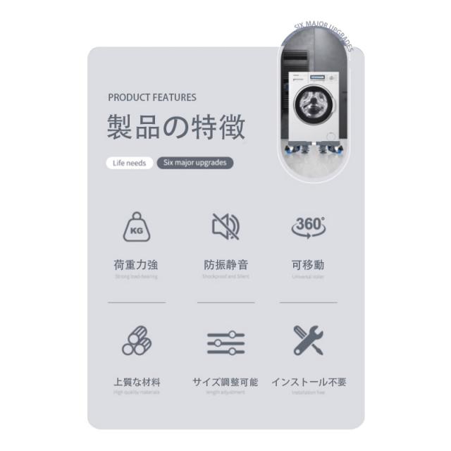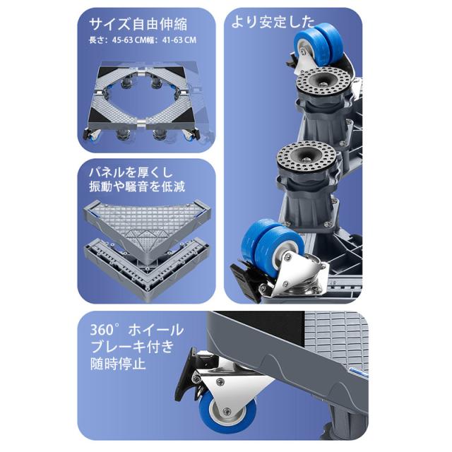 【キーワード】洗濯機台 かさ上げ キャスター付き 置き台 洗濯機 台車 置台 防水パン 洗濯機パン 縦型 底上げ 移動 4輪4足 組み立て簡単 幅41-64cm ドラム式 振動防止 騒音防止 伸縮式