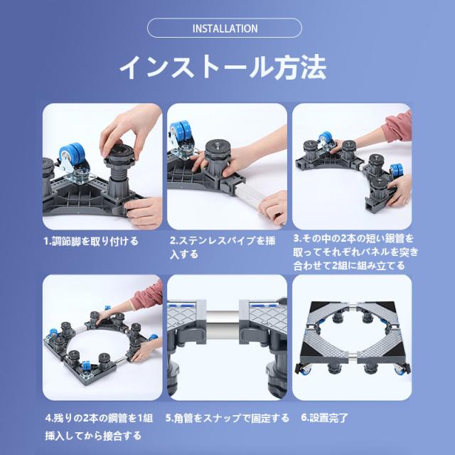 【安定感抜群】耐荷重は500キロなので、洗濯機や冷蔵庫の中身が入っても安心。4本のジャッキで重さを分散し、捻じれにくい四角い太パイプで緩みを防止しながら支えます。