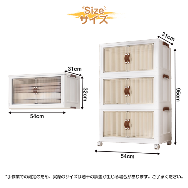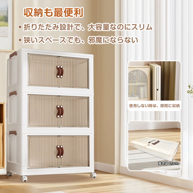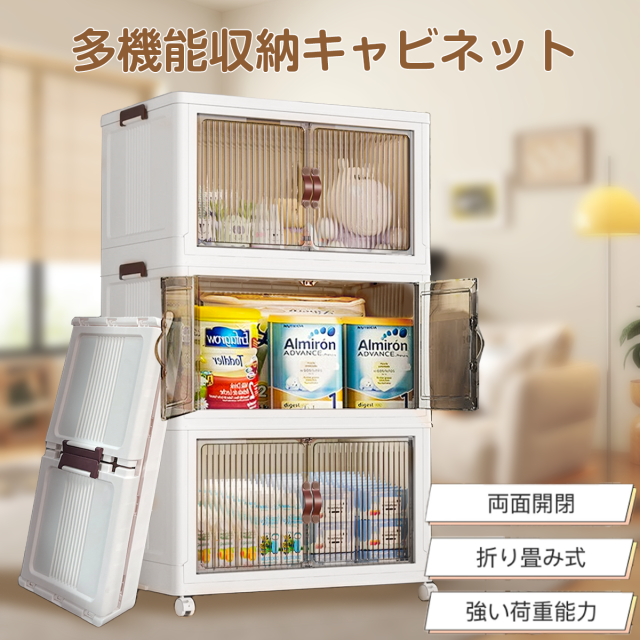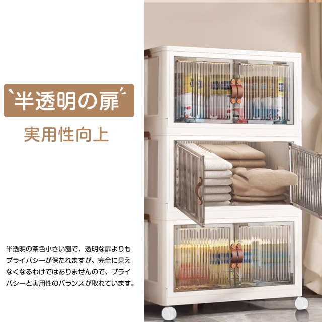 【送料無料】収納ボックス 折りたたみ 3段 コンテナボックス 大キャスター付き 積み重ね強い耐荷重 大容量 両面開き 組立簡単 扉付き フタ付き 移動便利 収納ケース コンパクト 大型 衣類 布団 複数のサイズ おしゃれ ホワイト