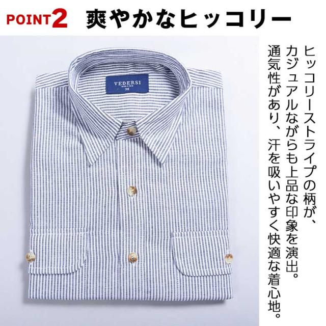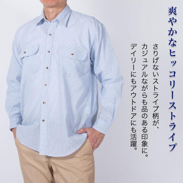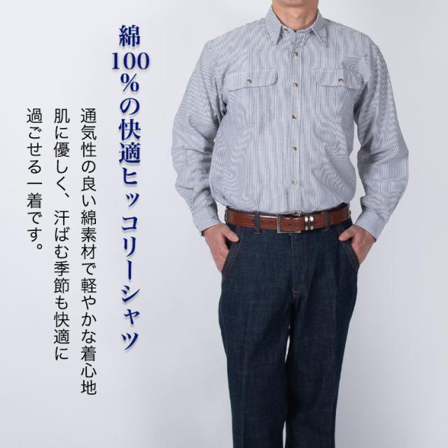 【キーワード】 ヒッコリーシャツ カジュアルシャツ 長袖 紺 ネイビー ブルー 青 綿素材 綿100 コットン100% ストライプ 自然素材 単品 メンズ 男性 紳士 散歩 旅行 シニア ミドル ゆったり ゆとり 父の日 敬老の日 プレゼント ギフト 贈り物 大きいサイズ ビッグサイズ