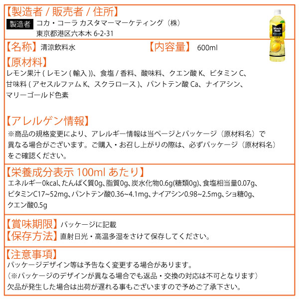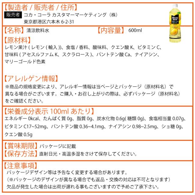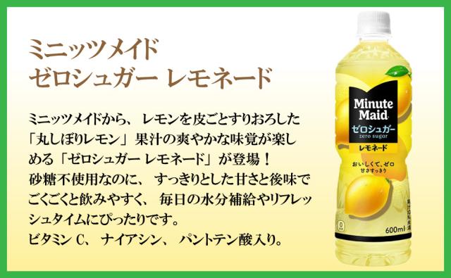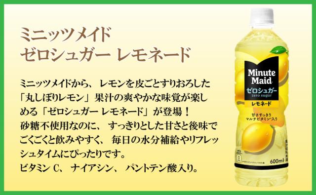 ミニッツメイド ゼロシュガー レモネード 600ml 48本 (24本×2ケース) PET レモン ビタミン 安心のメーカー直送 日本全国送料無料
