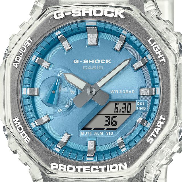 ベースモデルはオクタゴンベゼルのGA-2100を採用。文字板に人気のカラーリングであるスカイブルー、ローズゴールド、シルバーのメタル蒸着塗装を施し、ベゼルとバンドはスケルトン素材にすることで、サマーシーズンに向け涼しげな印象に仕上げました。