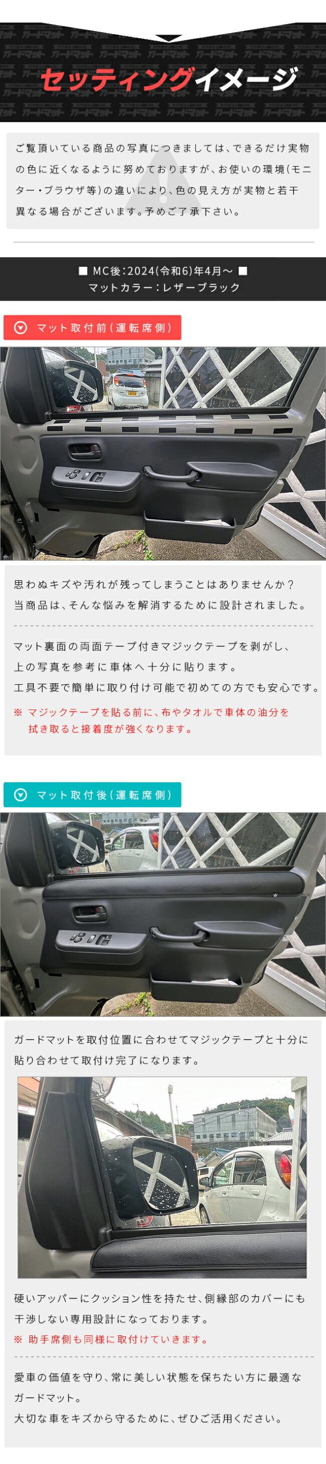 | 商品のポイント | スズキ キャリイ スーパーキャリイ DA16T用のガードマットは、専用設計でアッパードアトリムをしっかりと保護しますのでキズや汚れから愛車を守ります。2枚組で、取り付けも簡単。実用性とデザイン性を両立させた一品です。愛車をより快適に、スタイリッシュに演出します。 |