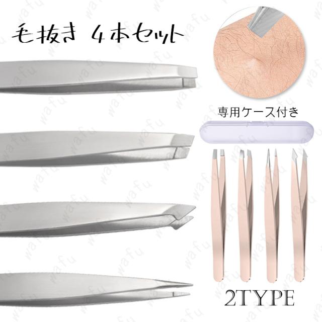 br242#毛抜き 4本セット 当日発送 2type ピンセット ムダ毛 眉毛 処理 収納ケース付き メイク道具 身だしなみ フェイスケア 先平 ステンレス製 先細 ツィザー