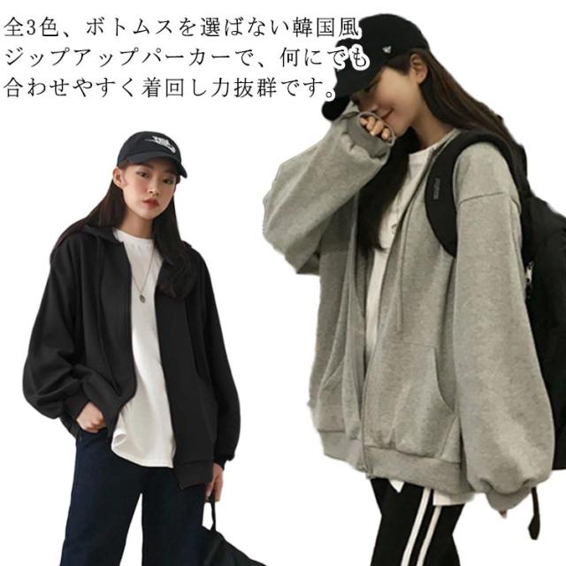 薄手 ジップアップ スウェット フード付き フードパーカー 無地 春秋 おしゃれ ジップアップ 着回し ゆったり 着痩せ レディース パーカー 韓国ファッション 通勤 通学 カジュアル M L XL 2XL グレー ブラック