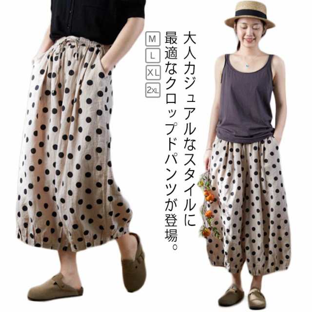 送料無料 ワイドパンツ リネンパンツ バルーンパンツ スカーチョ 9分丈 レディース 夏 水玉 ドット柄 ガウチョパンツ ルーズ ボトムス 綿麻風 大きいサイズ スカンツ イージーパンツ ナチュラル ゆったり ウエストゴム ナチュラル 春 大人