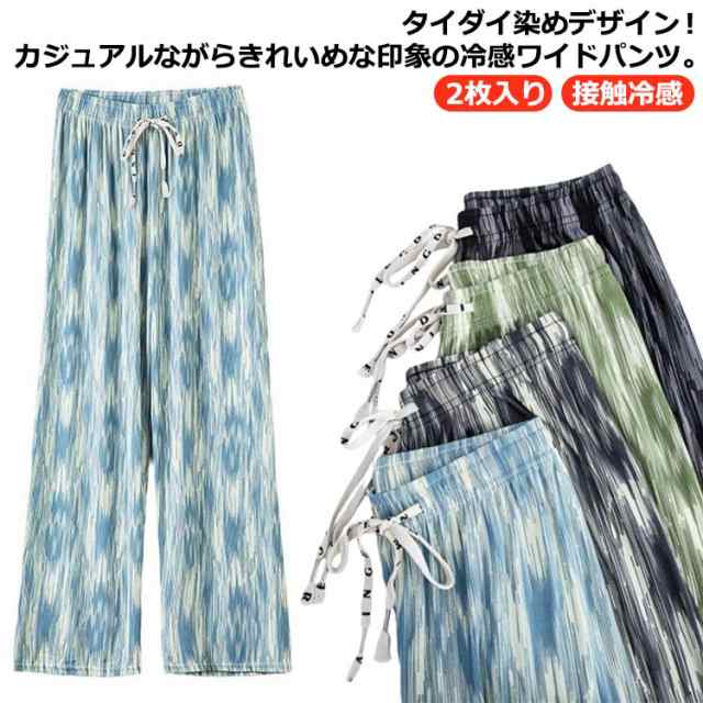 タイダイ染め ワイドパンツ レディース 2枚入り 接触冷感 パンツ 冷感パンツ イージーパンツ カジュアルパンツ 夏 薄手 ロングパンツ おしゃれ 着痩せ 柄パンツ 体型カバー サマーパンツ ウエストゴム ストレスフリー