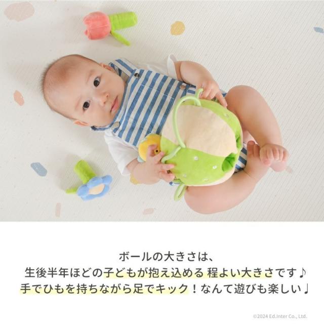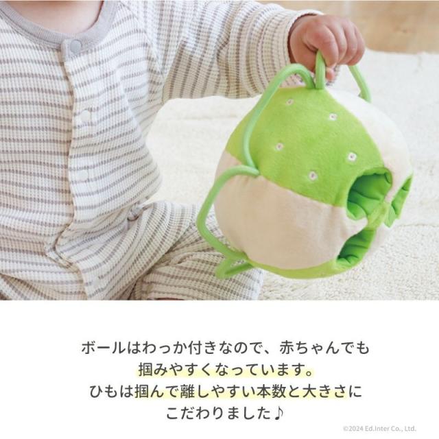 ボールの大きさは生後半年の子どもが抱え込める程よい大きさ。手で紐のわっかを持ちながら、ぶんぶん振ったり足でキック!なんて遊びも楽しめます。