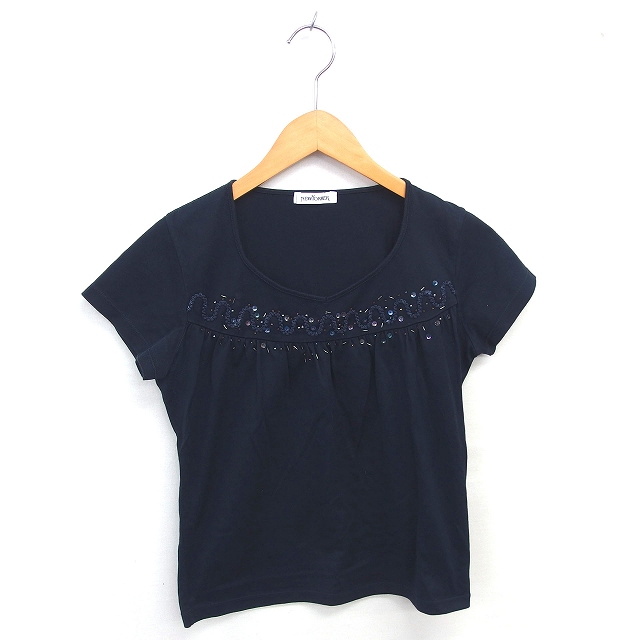 【中古】ニューヨーカー NEWYORKER カットソー Tシャツ ペンタゴンネック ビーズ装飾 半袖 M ネイビー 紺 /TT