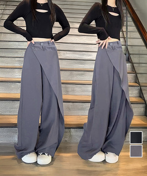 イレギュラー ハイウエスト ワイドパンツ オフィスカジュアル ストレートパンツ 非対称 美脚脚長 ロングパンツ 通勤OLきれいめカジュアル 体型カバーズボン黒 春秋夏ボトムス新作