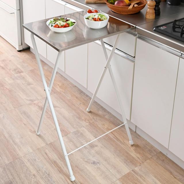 【コンパクトに折り畳み可能】折りたたむと約5cmとスリムになるので、使わないときはすき間に収納できる折りたたみテーブルです。 【熱に強いステンレス天板】天板はお手入れカンタンなステンレス製で、耐熱温度200度と熱にも強い仕様です。※天板四隅に埋まっているパーツは耐熱性ではありませんので熱い鍋等が直接あたらないようにご注意ください。 【作業のしやすい高さ設計】高さは85cmとキッチンカウンターと同じような高さになっているので、調理のときの補助台としても使いやすいです。 【統一感のあるステンレス】ステンレス天板なので、キッチンに置いても統一感のあるインテリアに。