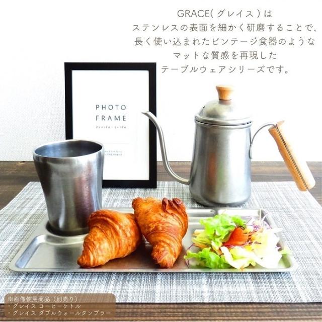 GRACE(グレイス)はステンレスの表面を細かく研磨することで、長く使い込まれたビンテージ食器のようなマットな質感を再現したテーブルウェアシリーズです。