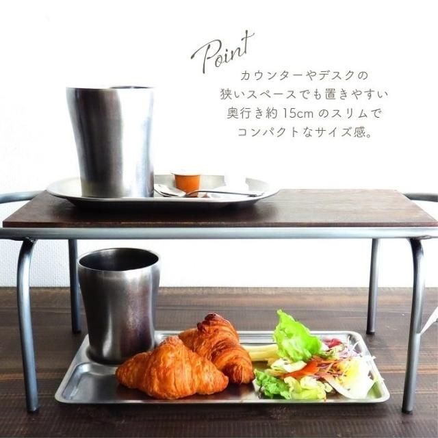 モーニングやランチに使える仕切り付きのサービングトレー。カウンターやデスクの 狭いスペースでも置きやすい奥行き約15cmのコンパクトなサイズ感です。クリップやペンなどステーショナリーグッズを整頓するインテリアトレーとしてもおすすめです。