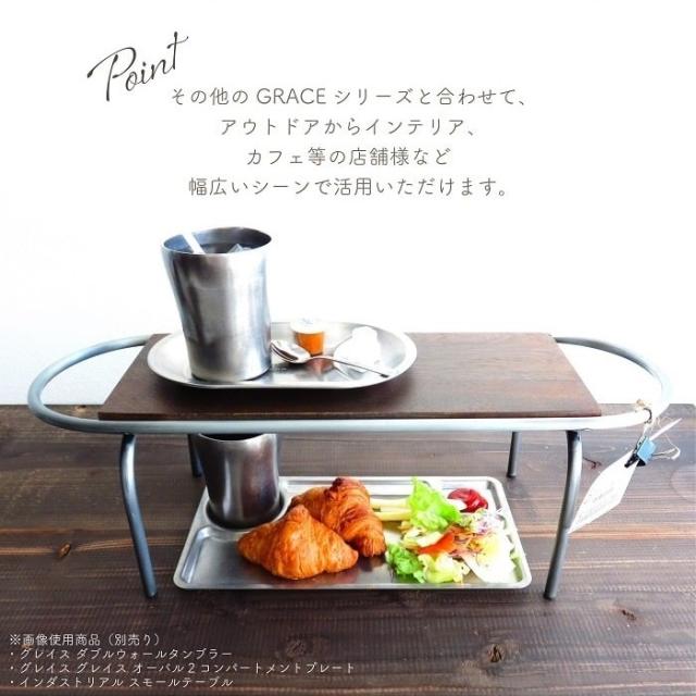 ステンレスのクールなカラーと、マットな質感がまとう上質な雰囲気は ヴィンテージ&インダストリアルアイテムが好きな方におすすめ。その他のGRACEシリーズと合わせて、アウトドアからインテリアまで幅広いシーンで お楽しみいただけます。