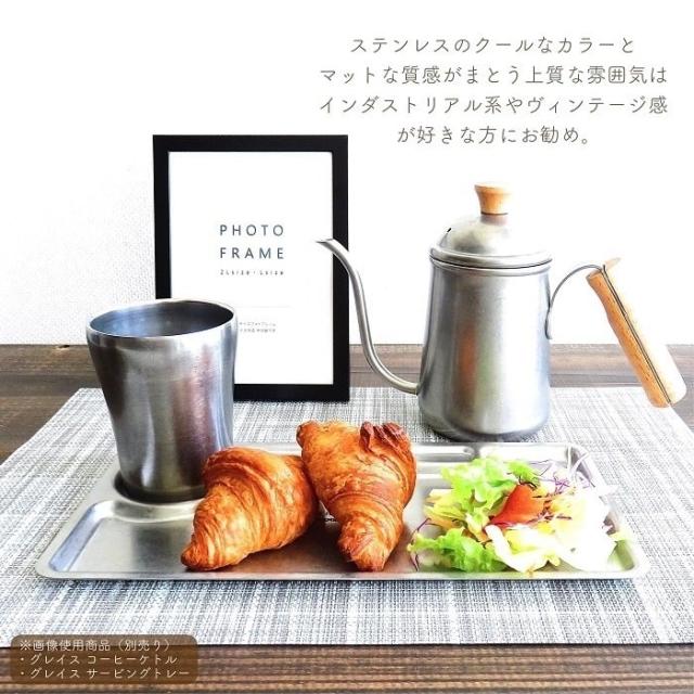 冬は温かいコーヒーに、夏は氷を入れたカフェオレなどに一年中使えるデイリーユースなサイズのタンブラーです。ステンレスのクールなカラーと、マットな質感がまとう上質な雰囲気はヴィンテージ&インダストリアルアイテムが好きな方におすすめ。その他のGRACEシリーズと合わせて、アウトドアからインテリアまで幅広いシーンでお楽しみいただけます。