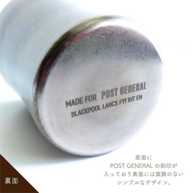 ダブルウォールタンブラーは冷たいものも熱いものも温度が変化しにくい 中空断熱構造になっており、熱い飲み物を入れても素手で持つことができます。底面にPOST GENERALの刻印が入っており、表面には装飾のないシンプルなデザイン。
