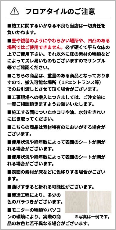 また、ヒーター等で熱風が直接表面にあたると、反りの原因になり、床暖房やホットカーペット、こたつの使用も反りが発生する恐れがありますので予めご注意ください。