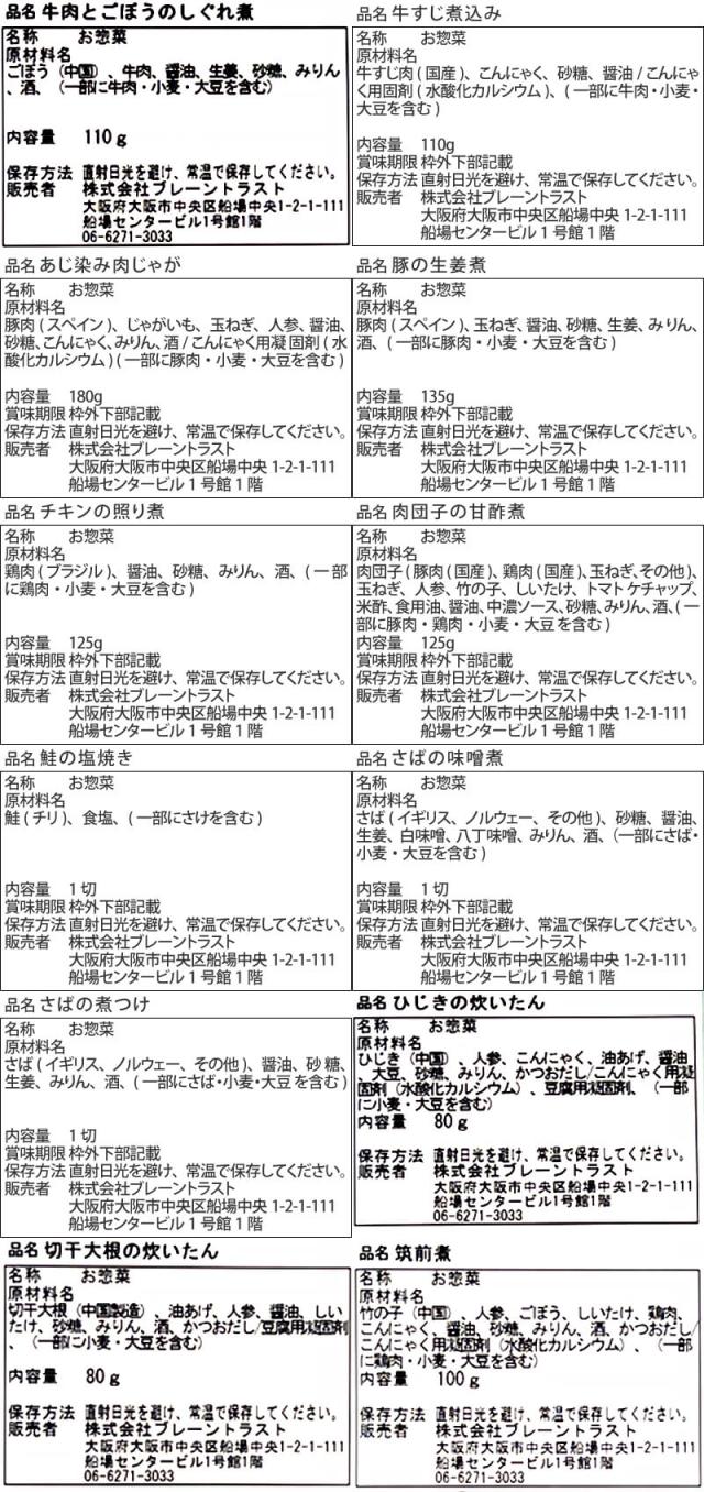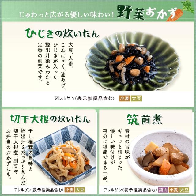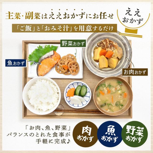 ■ ええおかず 牛肉とごぼうのしぐれ煮 110g 牛すじ煮込み 110g あじ染み肉じゃが 180g 豚の生姜煮 135g チキンの照り煮 125g 肉団子の甘酢煮 125g 鮭の塩焼き1切 さばの味噌煮 1切 さばの煮つけ 1切 ひじきの炊いたん 80g 切干大根の炊いたん 80g 筑前煮 100g 12種 12食 |