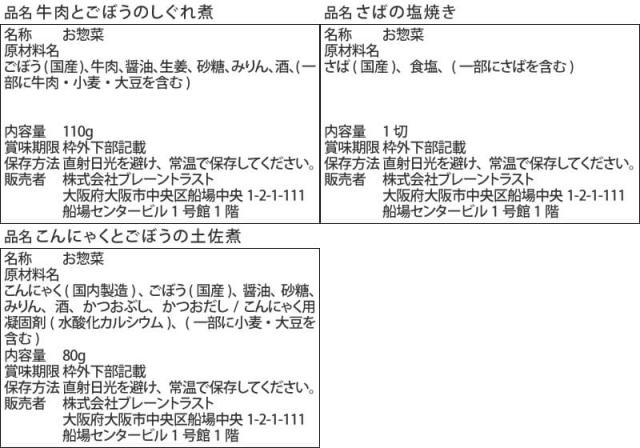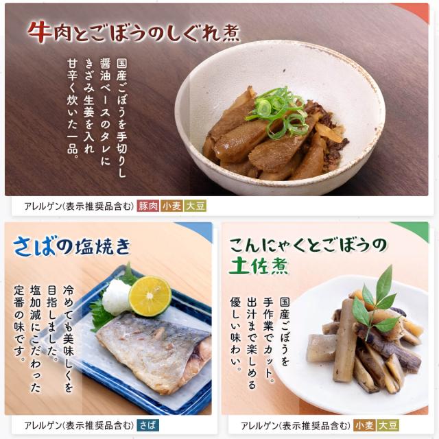 | 内容量 | ■ ええおかず 牛肉とごぼうのしぐれ煮 110g さばの塩焼き 1切 こんにゃくとごぼうの土佐煮 80g 3種 3食 |