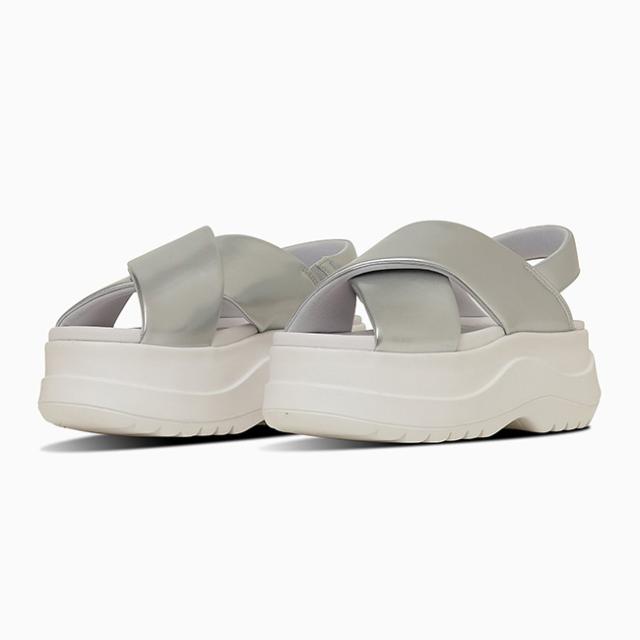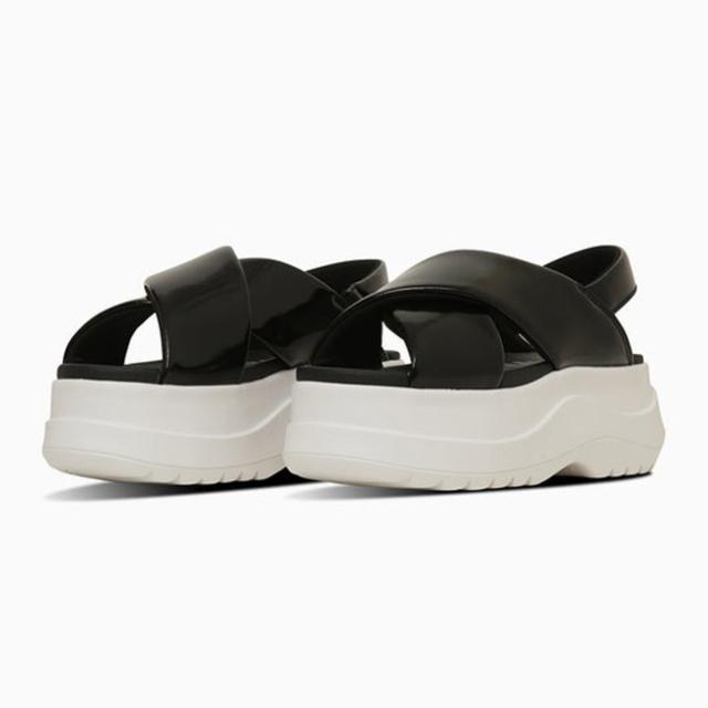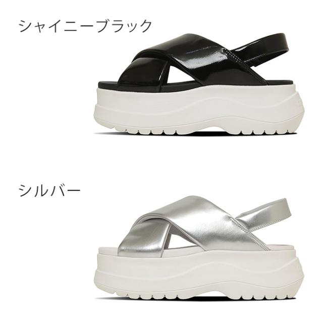 ボリュームのある厚底ソールとクロスベルトがエレガントなデザインで、幅広いコーディネートに取り入れられる一足