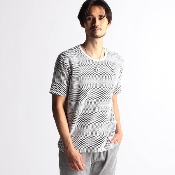 インパクトの強い幾何学柄を無地とモノトーンで表現する事で大人綺麗目なモードテイストに仕上げています。デザインはシンプルなクルーネックタイプ。ジャストサイズでインナー用として、オーバーサイズで重ね着用としても楽しめるアイテムです。