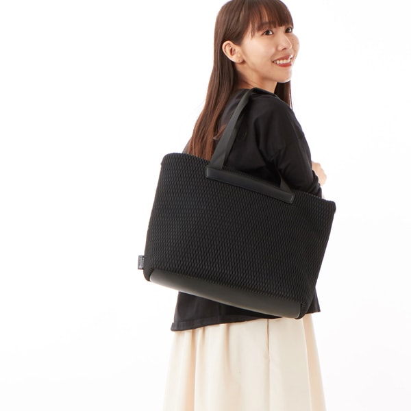 しっかり自立するのに軽量。使い勝手の良いA4OKの大容量トートバッグ。手触りの良いサラッとした素材感。