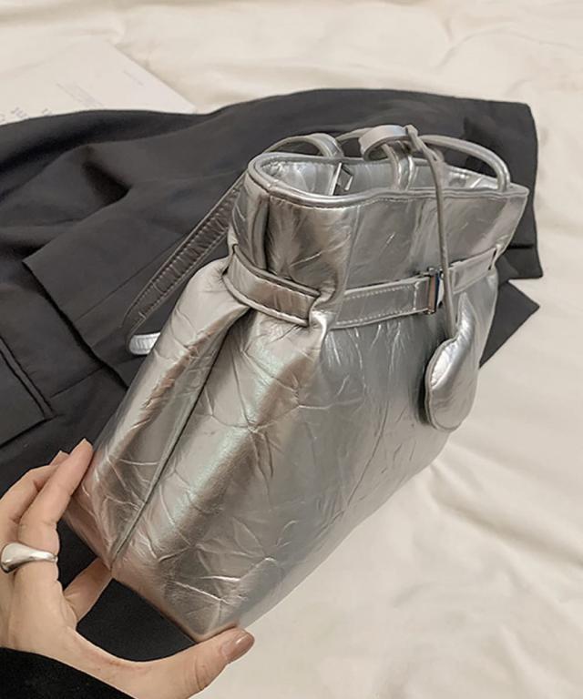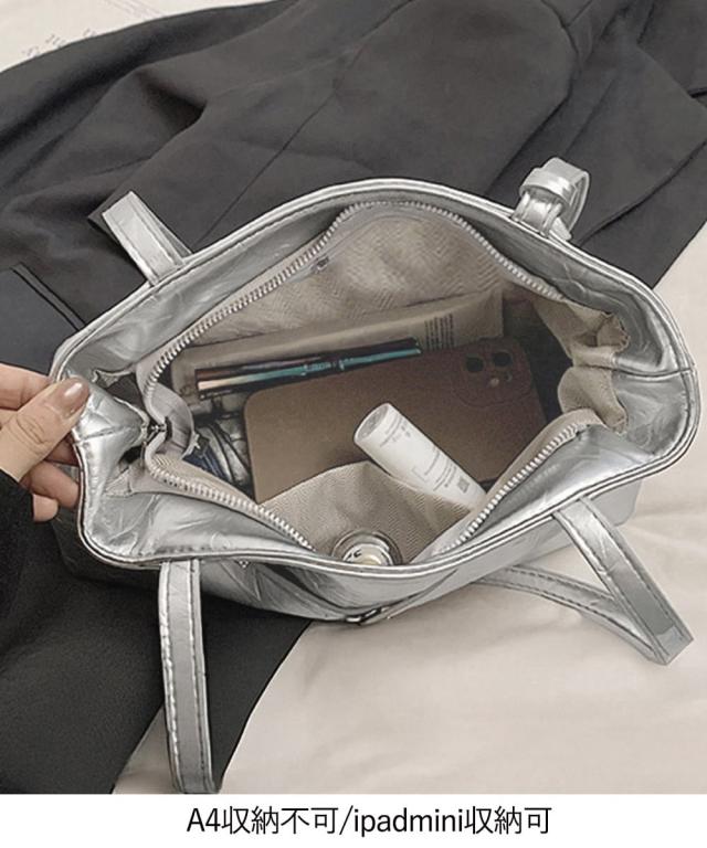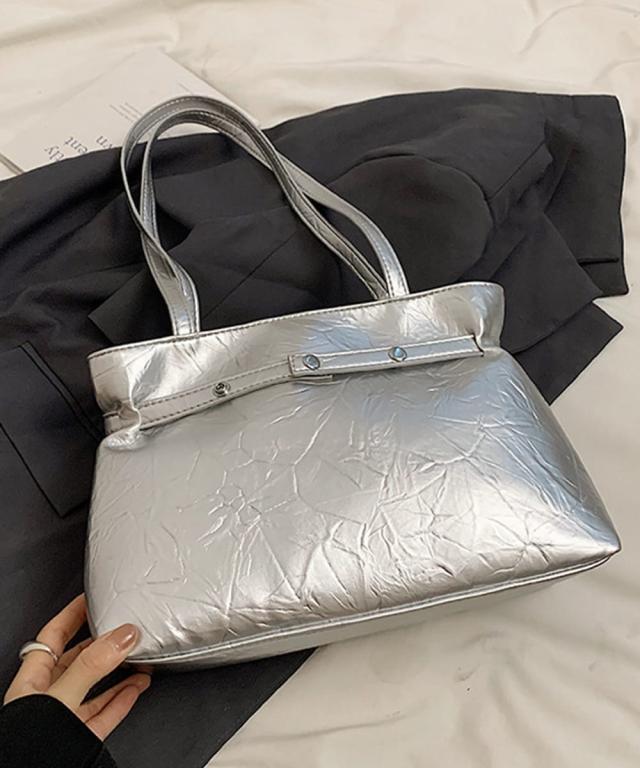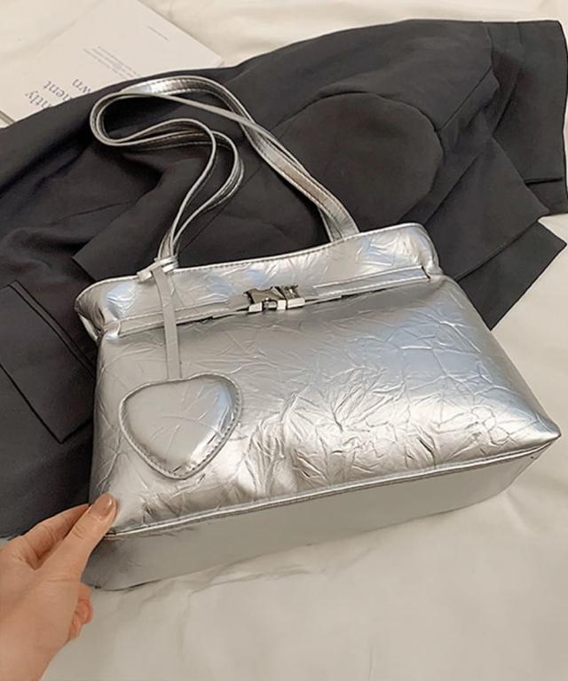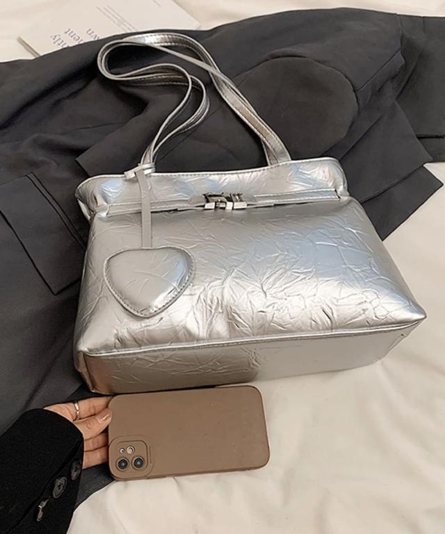 ハート型のチャームが魅力的な、洗練された輝きを放つメタリックトートバッグ