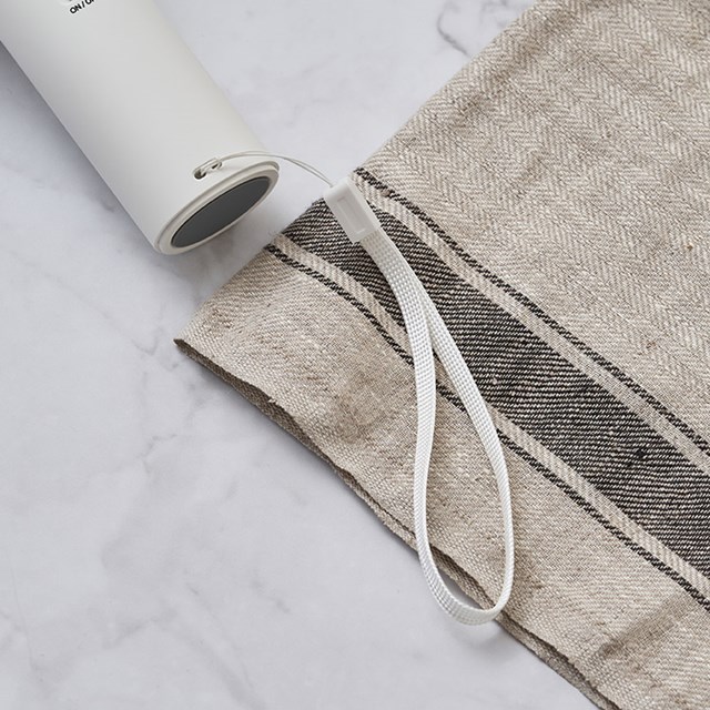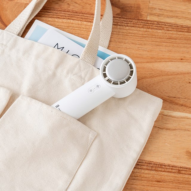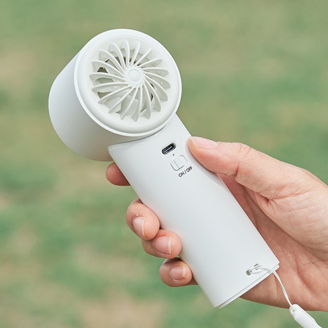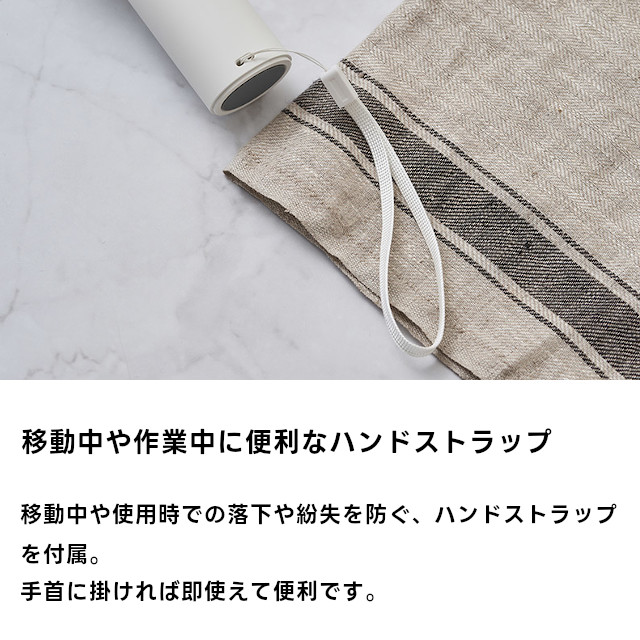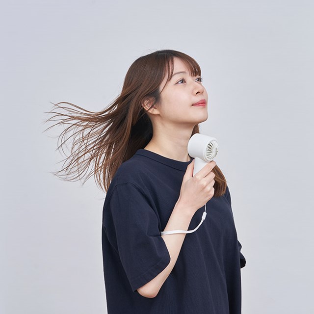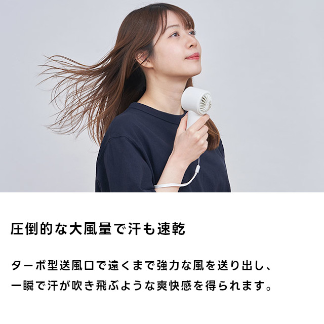 パワフルなターボ型送風口から送られる風量は、5段階から調節可能。小型サイズのため携帯性に優れ、またハンドストラップを付属することで、 落下や紛失を防ぐなど、使いやすさにもこだわりました。