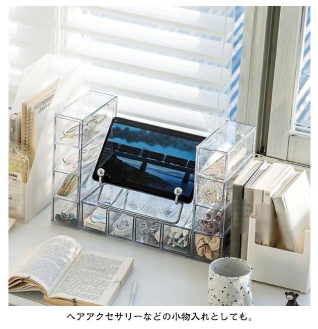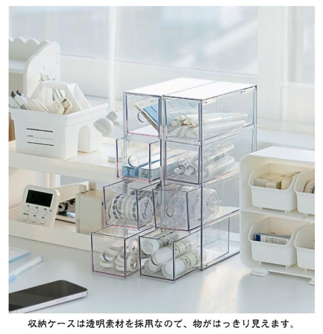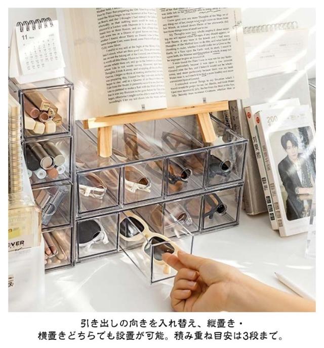 | 4段の引き出しにメガネや小物が収納できるの収納ケース。【横置き&縦置き2way】 引き出しの向きを入れ替え、縦置き・横置きどちらでも設置が可能。積み重ね目安は3段まで。 収納ケースは透明素材を採用なので、物がはっきり見えます。 ヘアアクセサリーなどの小物入れとしても。 | |