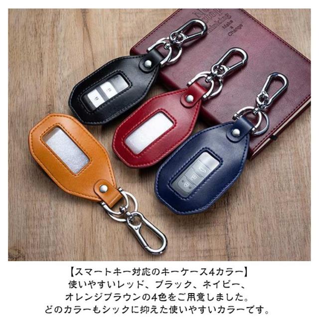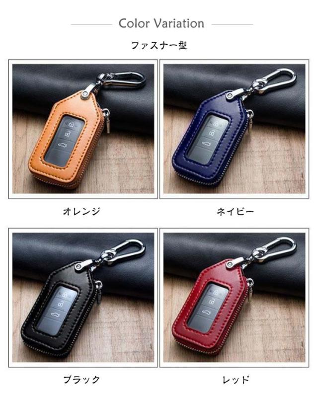 | ファスナー型&ボタン型2タイプ 4色 【スマートキー対応のキーケース4カラー】 使いやすいレッド、ブラック、ネイビー、オレンジブラウンの4色をご用意しました。どのカラーもシックに抑えた使いやすいカラーです。 【窓付き】 ボタンは透明な窓からはっきりと見え、キーケースを開かなくても簡単に押すことができます。買い物後に両手が荷物でいっぱいのときなど、ケースのファスナーを開ける面倒な作業が省けます。 【持ち運びに便利】 ちょうどよい大きさでかさばらず、手のひらにフィットする絶妙のサイズで、スマートキーをすっきり収納できます。サッと取り付けることができる快適な使い心地のカラビナフックとキーリングの2種類を採用しています。外に出たら直接ズボンのベルトにかけたり、カバンの内側などに取り付けてください。 【贈り物として最適】 シンプルでオシャレなデザインは、メンズ、レディース問わず長くお使いいただけます。自分用もちろん、プレゼントギフトにも最適なアイテムです。学校行事や会社の記念品もご愛用いただいております。 | |