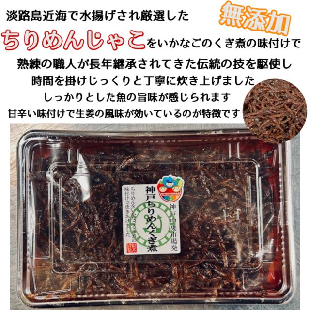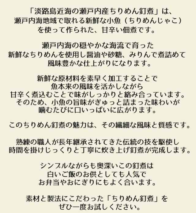 【原材料名】 ちりめん(淡路島産または淡路島近海の瀬戸内産)、砂糖、醤油、生姜、味醂、水飴