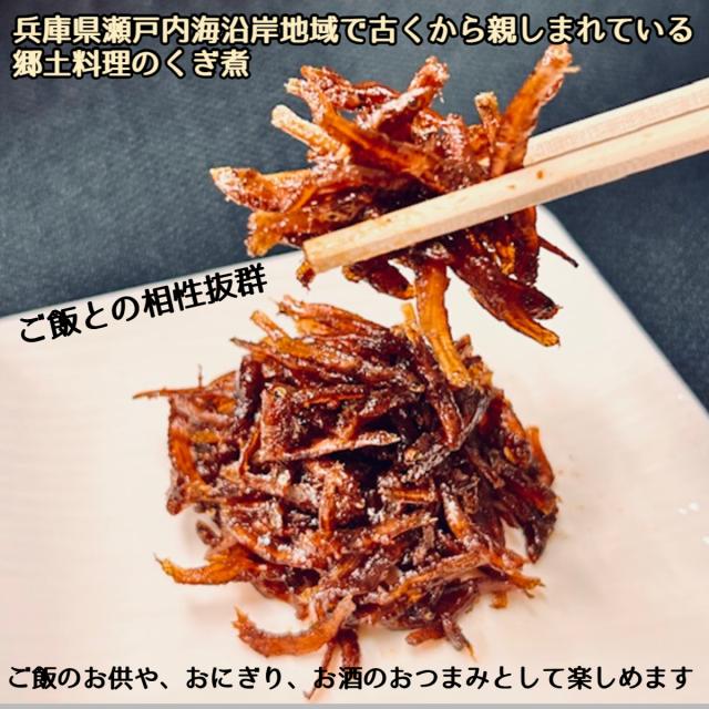 | ちりめんくぎ煮 淡路島近海の恵まれた環境で育ったちりめんならではの 程よい歯ごたえがクセになること間違いありません。 シンプルながらも奥深いこの釘煮は白いご飯のお供としても人気で、 お弁当やおにぎりにもよく合います。 素材と製法にこだわった「ちりめん釘煮」をぜひ一度お試しください★ |