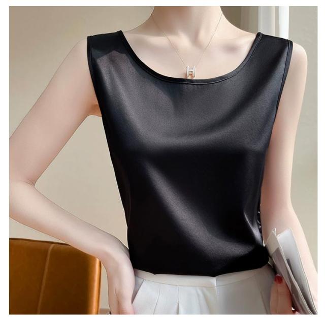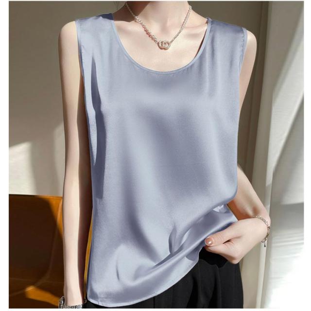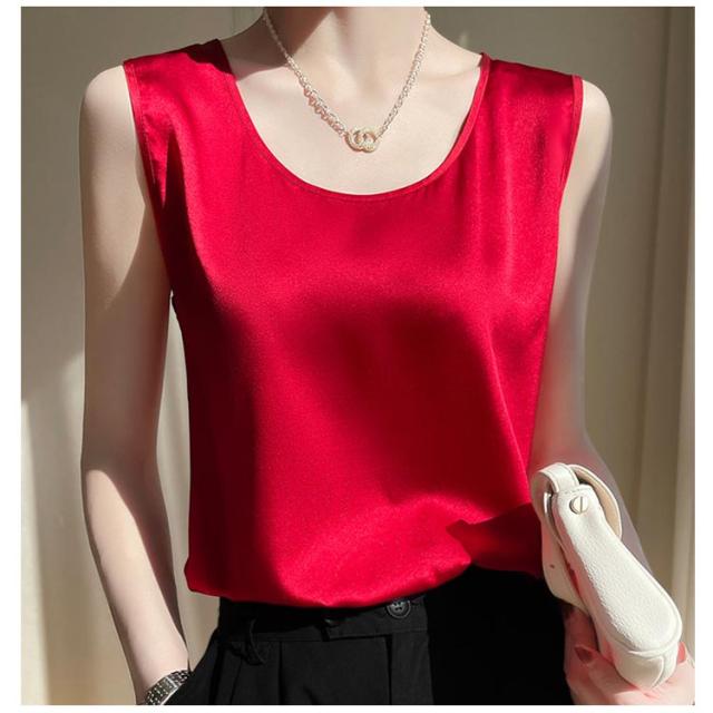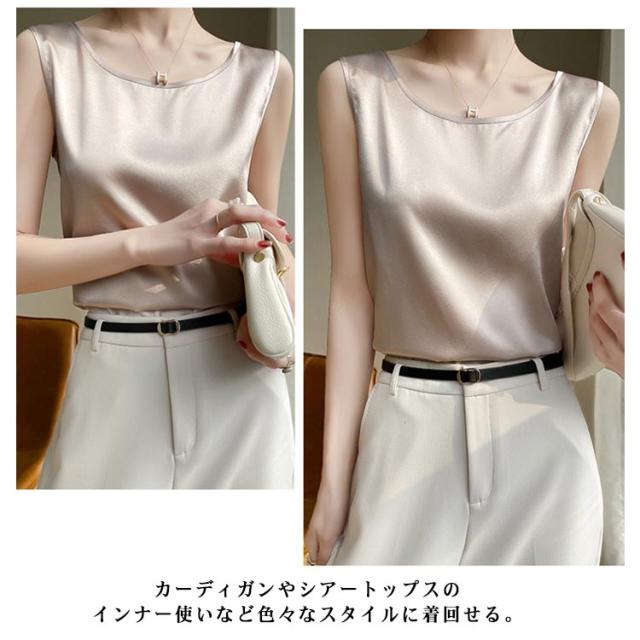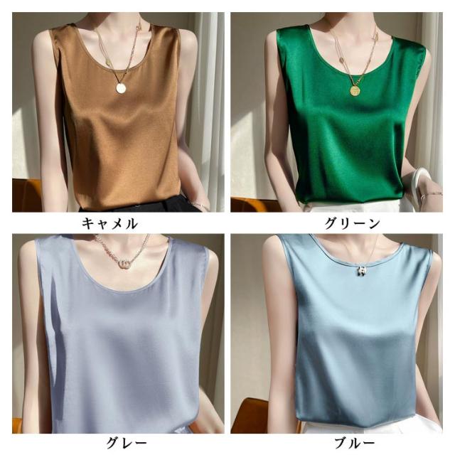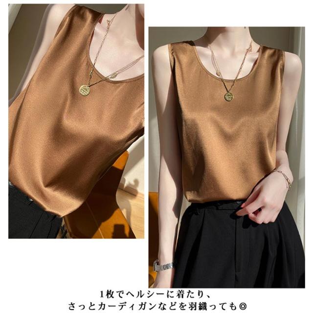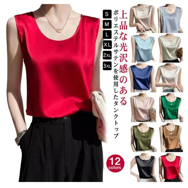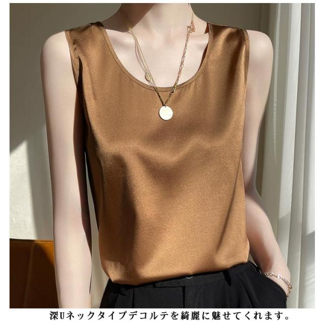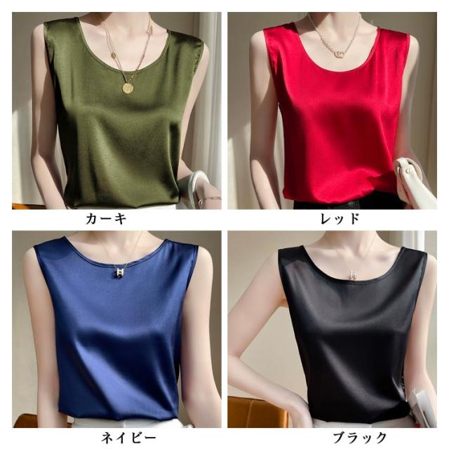 サテンタンクトップ サテンキャミソール Uネック レディース インナー 下着 キャミソール タンクトップ ラウンドネック サテン 光沢感 春 夏 接触冷感 透けない 蒸れない ゆったり 体型カバー 大人可愛い