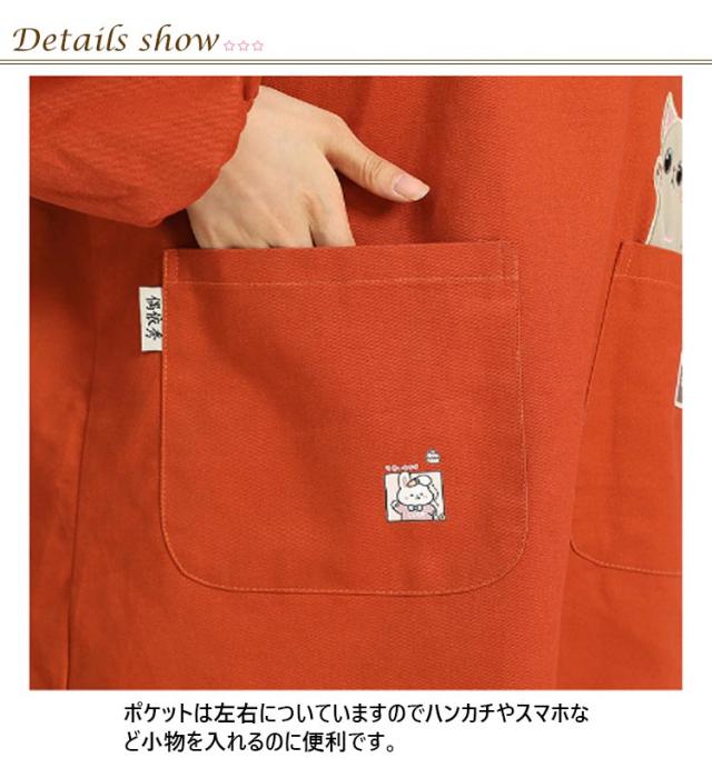 | お仕事用におすすめ スタンダードなデザインの割烹着 普段の家事炊事お家使いはもちろんのこと、介護士さんや保育士さんなどお仕事用にもおすすめ。 ポケットは左右についていますのでハンカチやスマホなど小物を入れるのに便利です。 上下ともリボンでとめるタイプですのでさっと脱ぎ着できます。 腕まくりしやずいように袖口はゴム入りの仕様となっています。 | |