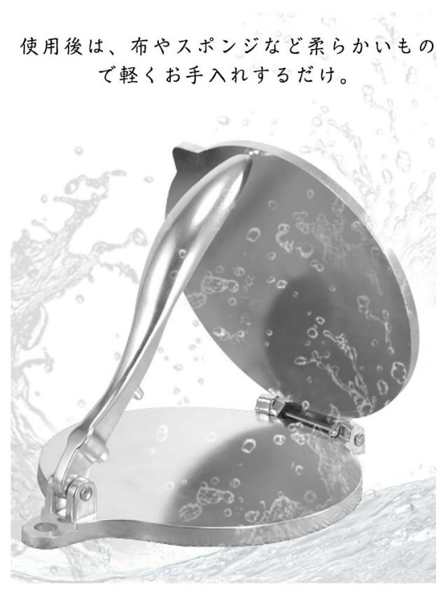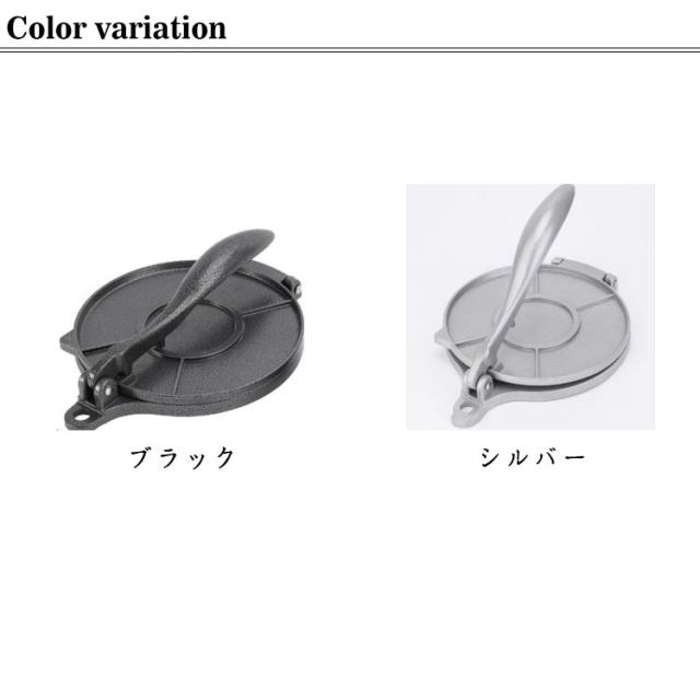 | 余計な力をかけずにスピーディーにトルティーヤを作れるトルティーヤプレスです。 使用後は、布やスポンジなど柔らかいもので軽くお手入れするだけ。 錆びにくいアルミ合金製です。 ピザや餃子、タコスなどの皮を作るときにもご活用いただけます。 軽くてコンパクトなので持ち運びやすく、アウトドアでも大活躍してくれること間違いなしです。 | |