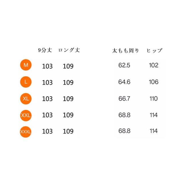 | サイズについての説明 | サイズ 9分丈 ロング丈 腹周り もも周り ヒップ ※サイズ表の実寸法は商品によって1-3cm程度の誤差がある場合がございます。 |