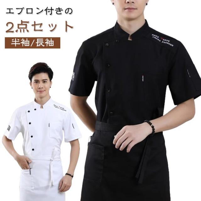 通気性 コックウェア トップス 半袖/長袖 秋 春 調理白衣 【2点セット】コックシャツ コック服 ユニフォーム 【2点セット】コックシャツ 夏 厨房服 コックコート 制服 薄手 エプロン付き 男女兼用 飲食店 厨房 仕事着 おしゃれ 白 黒