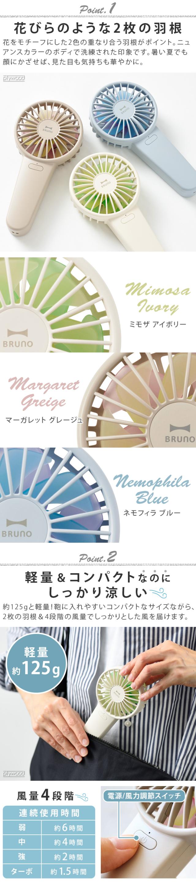 BRUNOから花をモチーフにした、可愛らしいハンディファンの登場です。花のように重なり合う2色の羽根がポイント。コンパクトなサイズ感で、約125gと軽量ながら、2枚の羽根がしっかりとした風を生み出します。シーンにあわせて4段階の風量調節が可能。いつでもどこでも使えるUSB充電式で、長押し1秒で電源オンするため、誤作動を防ぎます。角度調節ができるスタンドと、両手が空く便利なストラップ付きで、家でも外でも使い勝手抜群!