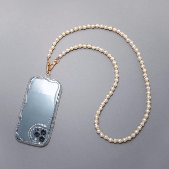 大粒で存在感のあるパールとロンデルのスマホショルダーストラップ。グッとラグジュアリーに仕上がるデザインがコーデにアクセントを添えるひと品。オシャレも便利さも叶うデイリー使いにピッタリなアイテムです。