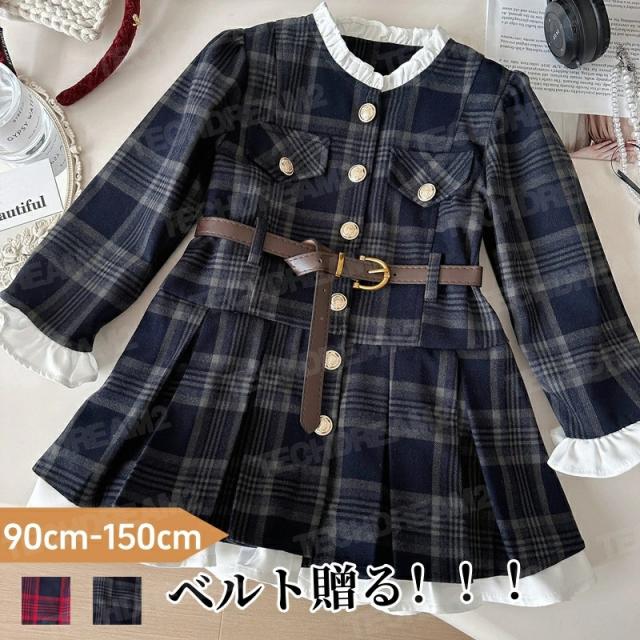 子供服 ワンピース 女の子 子供 フォーマルワンピース ベルト付き 長袖 丸襟 キッズ ワンピース フォーマル ドレス チェック柄 大人っぽい 結婚式 入園式 子ども服 ガールズ キッズ服 韓国風 入学式 卒園式 卒業式 お宮参り 誕生日 記念写真 ピアノ 七五三 発表会 普段着
